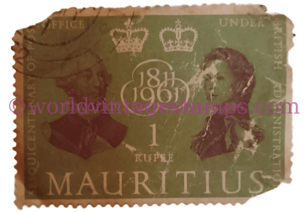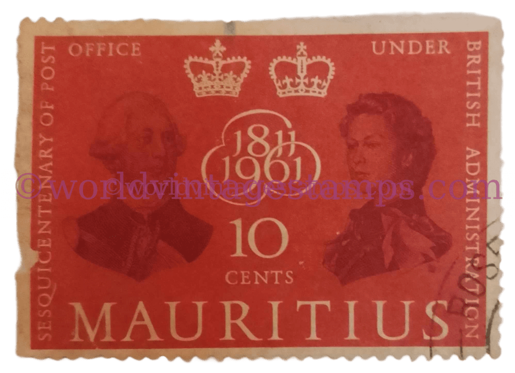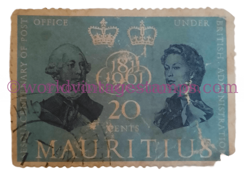 On the postage stamps, you can see King George III on the left, who was the King of Great Britain and Ireland during the establishment of the British Post Office in Mauritius. On the right, you can find Queen Elizabeth II, who was the Queen of the United Kingdom and other Commonwealth realms during the 150th anniversary of this event.